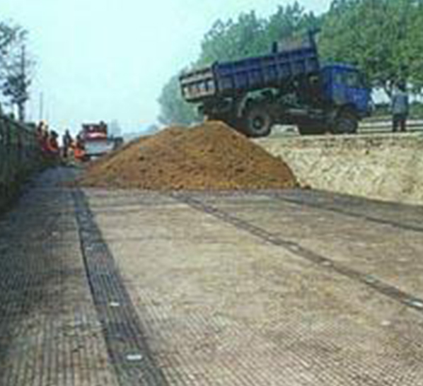 2、格柵鋪設:在平整壓實(shí)的場(chǎng)地上,安裝鋪設的格柵其主要受力方向(縱向)應垂直于路堤軸線(xiàn)方向,鋪設要平整,無(wú)皺折,盡量張緊。用插釘及土石壓重固定,鋪設的格柵主要受力方向是通長(cháng)無(wú)接頭,幅與幅之間的連接可以人工綁扎搭接,搭接寬度不小于10cm。如設置的格柵在兩層以上,層與層之間應錯縫。大面積鋪設后,要整體調整其平直度。當填蓋一層土后,未碾壓前,應再次用人工或機具張緊格柵,力度要均勻,使格柵在土中為繃直受力狀態(tài)。